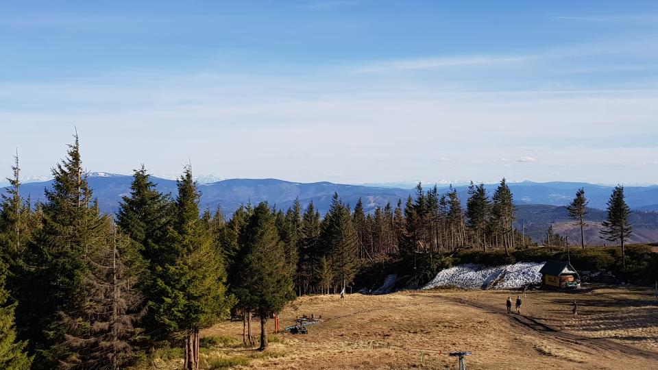 Po pokonaniu tego fragmentu, szlak wchodzi do lasu, by po kilkuset metrach dotrzeć na polanę tuż pod wierzchołkiem Skrzycznego, na którym znajduje się schronisko PTTK, wraz z widokowym tarasem i widoczną nieopodal wieżą przekaźnikową na szczycie. Czas na dłuższy odpoczynek w pełni zasłużony.